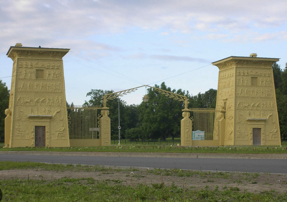 Below, there are three different examples of Egyptian Revival Style architecture from around the world. To the left, is an elephant enclosure at the Antwerp Zoo in Belgium, the middle gates outside of St. Petersburg, Russia, and to the right a synagogue in Tasmania. These different structures highlight the breadth and depth of applications and cities Egyptian Revival Style architecture has been used.